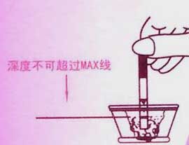 步骤2、将试纸鼓起来的一头插放尿液中,插放深度不要超过MAX线,但也不要太浅。